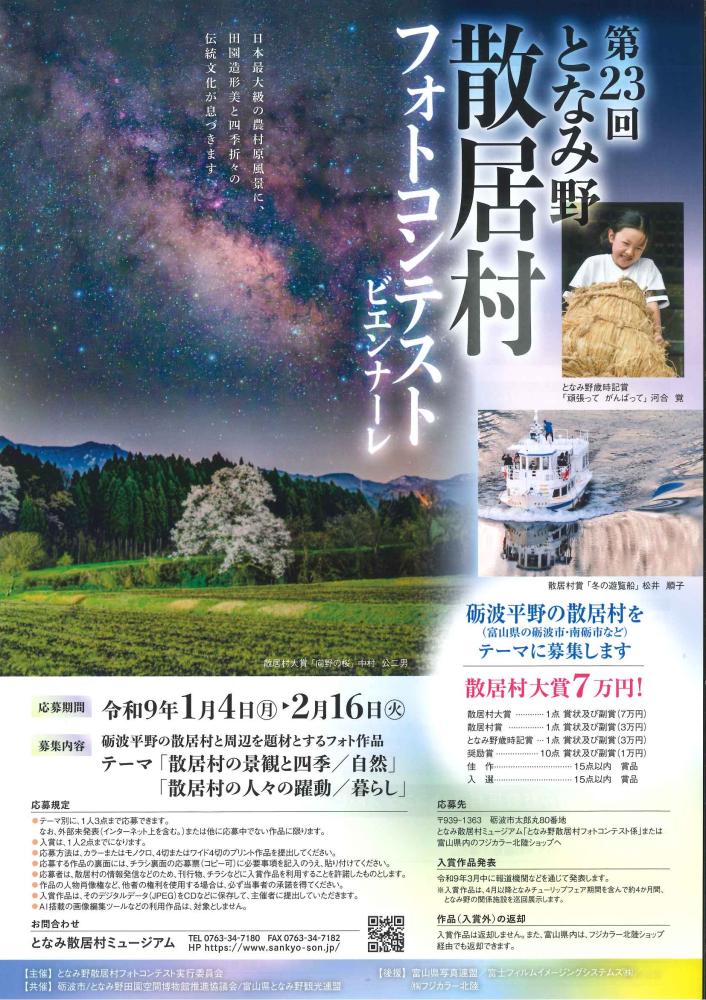 TOPお知らせ第23回となみ野散居村フォトコンテスト・ビエンナーレ作品募集のお知らせ 第23回となみ野散居村フォトコンテスト・ビエンナーレ作品募集のお知らせ2026年03月14日(土) 第23回となみ野散居村フォトコンテスト・ビエンナーレの写真作品を募集します。 【応募期間 令和9年1月4日(月)〜2月16日(火)】 砺波平野に広がる散居村は、農耕の歴史と人々の英知により育まれ、受け継がれてきた貴重な伝統景観です。 2年に一度、この景観と人々の姿をテーマに、写真作品を募集し、優秀な作品を地域情報の発信に役立てています。 皆様の素敵な感性で、美しい景観と素晴らしい伝統文化が根付くとなみ野のベストショットの応募をお待ちしています。 ●応募テーマ 「散居村の景観と四季/自然」 「散居村の人々の躍動/暮らし」 ●応募点数 テーマ別に、一人3点まで (未発表または他に応募中でない作品に限る) ●応募規格 4切またはワイド4つ切のプリント写真で 加工されていないもの ●応募期間 令和9年1月4日(月)〜2月16日(火) ●応募方法 郵送又は持参願います。 ●応募先(窓口) となみ散居村ミュージアム 「となみ野散居村フォトコンテスト係」 〒939-1363 砺波市太郎丸80番地 または富山県内のフジカラー北陸ショップへ ●入賞 散居村大賞(7万円) 散居村賞(3万円) となみ野歳時記賞(3万円) その他多数の入賞があります。 ●発表 令和9(2027)年3月を予定しています。 ●その他 入賞作品は返却いたしません。 募集チラシを添付しますので 詳細はチラシで確認してください。 となみ散居村ミュージアム 〒939-1363 砺波市太郎丸80番地 TEL(0763)34-7180 FAX(0763)34-7182 休館日 水曜日・第3木曜日・年末年始 《資料》第23回募集 チラシ (2.33MB) 一覧に戻る ×